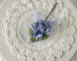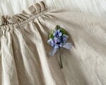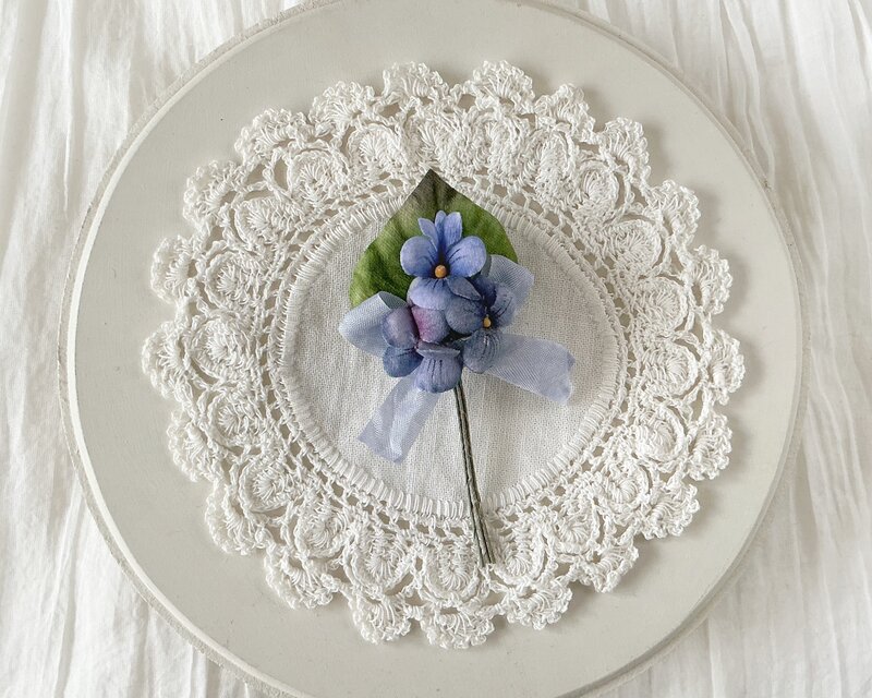 色味が異なる青紫のスミレの3輪と葉をまとめて、薄紫の小さなくしゅくしゅリボンをつけたコサージュ。