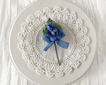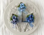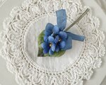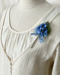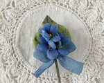スミレ3輪と葉をまとめて、ブルーの小さなくしゅくしゅリボンをつけたコサージュ。