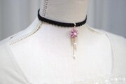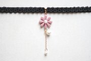 こっくりしたピンクのレジンのお花を、ベルベットリボンにタティングレースで装飾を施したチョーカーに仕上げました。