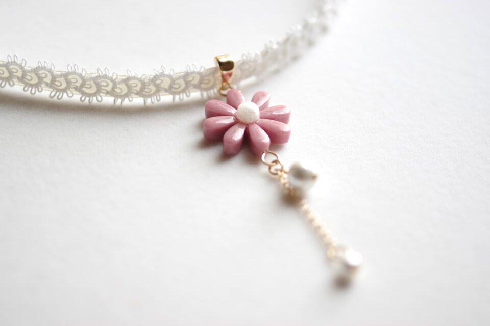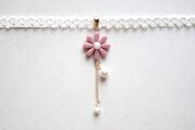 中心の花芯とコットンパールの光沢のある輝きが上品なチョーカー。