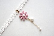 こっくりしたピンクのレジンのお花を、サテンリボンにタティングレースで装飾を施したチョーカーに仕上げました。