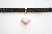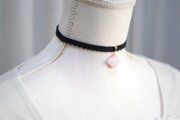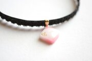 ホワイトとピンクの組み合わせが愛らしい、シャープなフォルムの中にも可憐さをのぞかせるレジンを、ベルベットリボンにタティングレースで装飾を施したチョーカーに仕上げました。