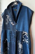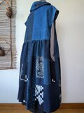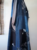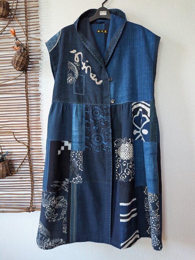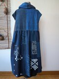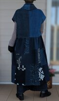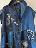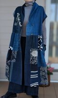 古布リメイク 飾りフードのフレンチ袖 ロング ジレ 藍染 刺し子 襤褸 ゆったりサイズ 着物リメイク 古布 boro