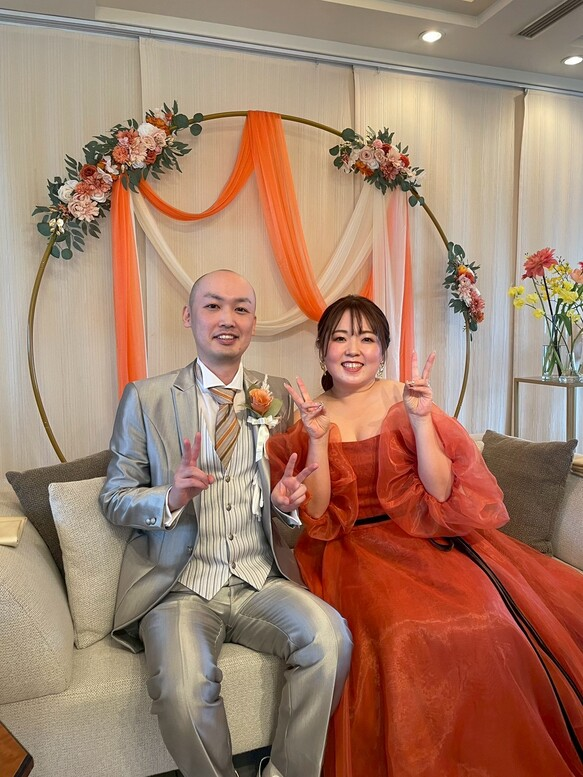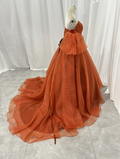 実例写真!カラードレス オレンジ ベアトップ 取り外し袖 上質オーガンジー ふわふわドレス 披露宴