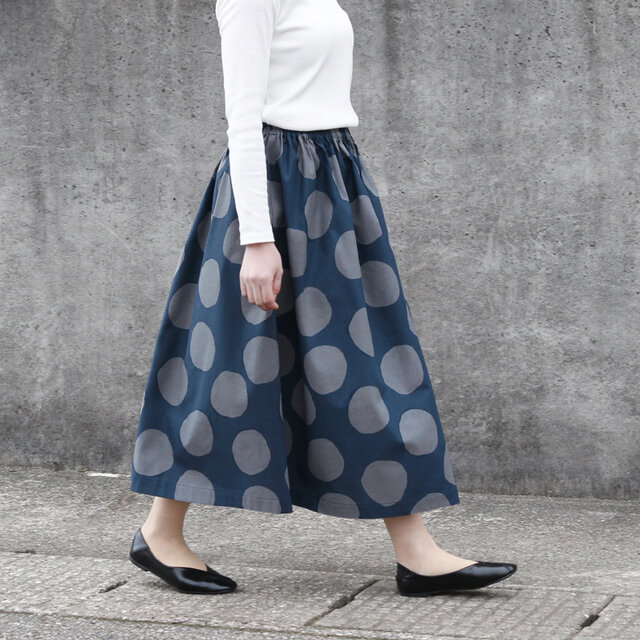 ランダムなドット柄がとても素敵です。コーデュロイなのにとても軽くて、タイツにもまとわりつかず裾さばきも良いです。長く使えるよう大切にします。