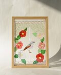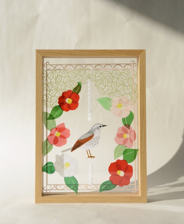 赤、ピンク、白のツバキとツグミをデザインして、切り絵にしました。