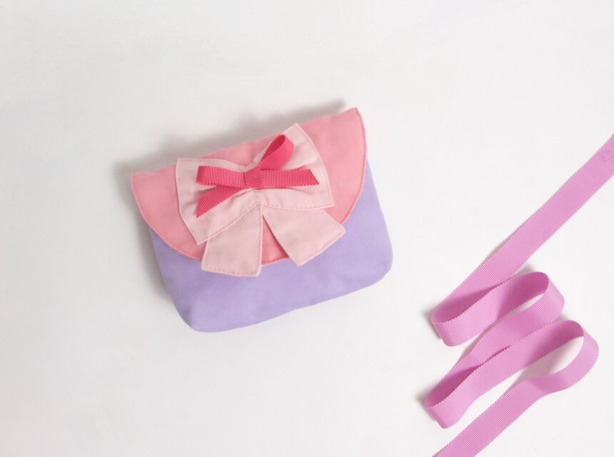 パステルカラー配色で、まるで不思議な力で変身できそうな憧れのリボンモチーフの移動ポケットです。