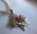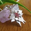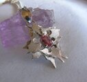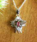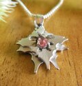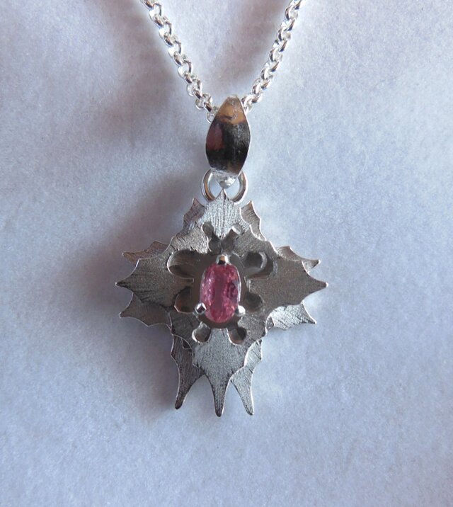 ピンクサファイアのペンダントです。サファイアはパパラティアとまでは言えませんが、ややオレンジがかったピンクのきれいな色で、本体の表面にはシルクラインを入れてあります。