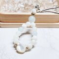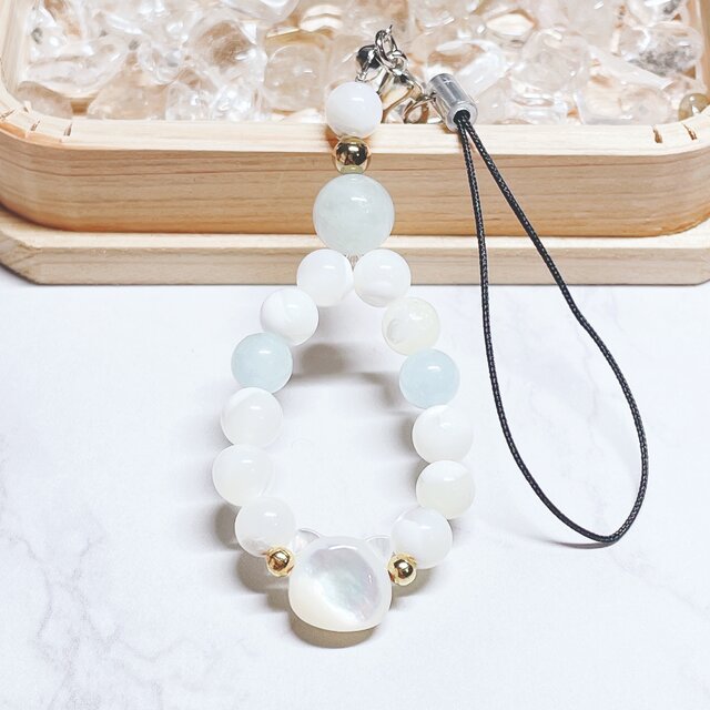 ✦白猫ストラップ|優しく、穏やかな自分へ♪ホワイトシェル(白ネコ・白ねこ)マザーオブパール・アクアマリンNo.853S