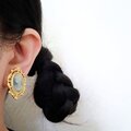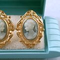 ヴィクトリアデザインの装飾が施されたゴールドメタルにグレーの貴婦人のカメオがあしらわれたヴィンテージイヤリングです。