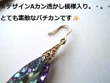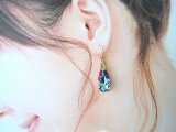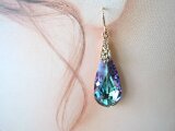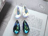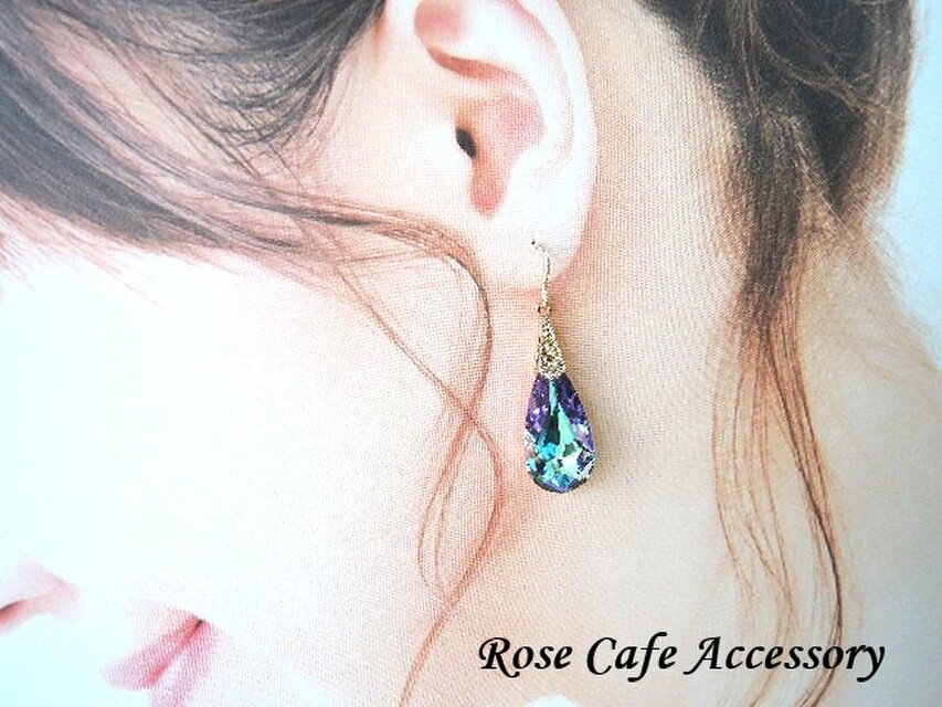 オーストリア製クリスタルガラス(#6100・3種類:高品質クリスタルガラス/約24×12mm)、スパークルフックピアス(サイズ小:約10×10㎜)、デザインAカン透かし模様(真鍮ゴールドメッキ)、フックピアス用シリコンキャッチ、ジェムストーンエッセンス(基本的には、シナジー12を使用して、お手入れをした後に、発送させていただきます。)