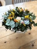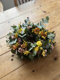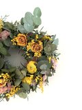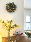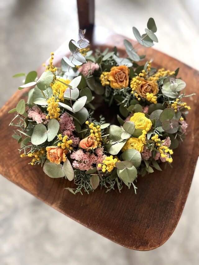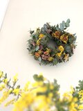 無事に受け取りました。とてもみずみずしいフレッシュなリースで、かわいいですね。実物も大満足です。とても良い香りで、葉っぱとミモザの配分も理想的で、大好きなリースになりました。また利用させていただきます。ありがとうございました!