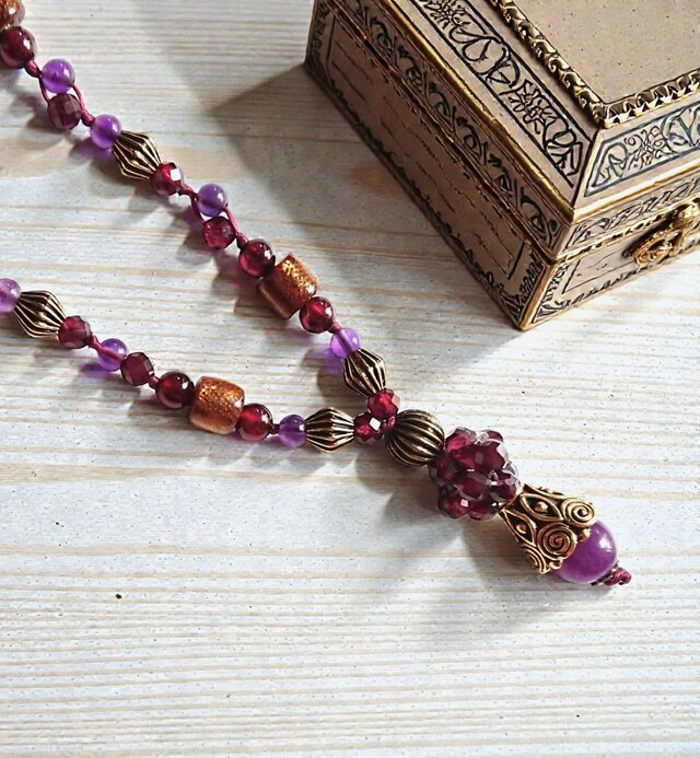 ガーネットとアメジストのアンティーク風 フリーサイズネックレス Y-2119