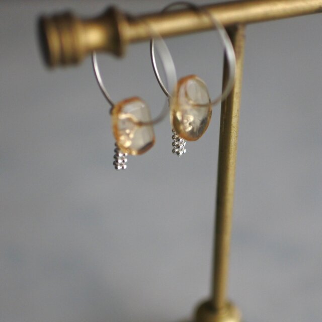 薄いガラスのようなシトリンと、小さな粒々シルバービーズを合わせたフープピアスです。