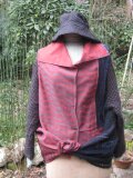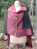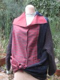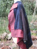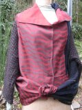 何時もは着物リメイクをしているのですが、この度、裂織の(写真にはありません)グリーン地ベストと赤の風呂敷とウールジャケットの袖(袖を取ったジャケットはベストになりました。写真3)との3点を組み合わせての長方形の型紙から何か創れないかと思い実行に移しました。いろんな着方が出来て面白いのではとそして暖かいのでOK。