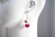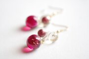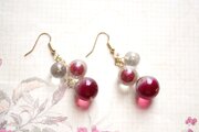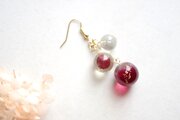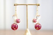 一つは小さなクリアーな粒、二つ目は光沢のある深い紅色に大胆に金色のラメをちりばめた中くらいの粒、そして三つめはやはり深い紅色とクリアーがグラデーションになった大きい粒。この三つが耳元で揺れる様子が軽やかで愛らしいピアスです。