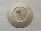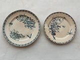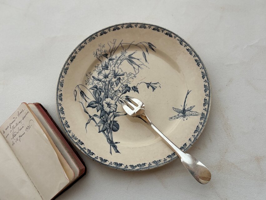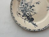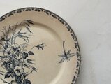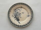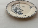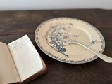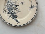 柔らかなクリーム地に、ブルーの濃淡で描かれたブーケとトンボの絵柄。リムを縁取るガーランドには控えめな木の実が配されており、全体的にコンディションの良い一枚です。