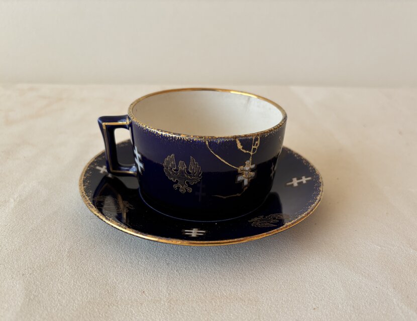 カップは真鍮粉を用いた金継ぎにてお直し済み。