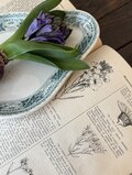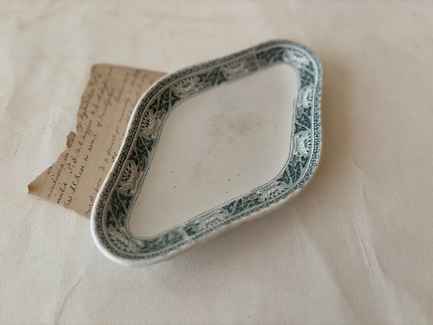 美しい白地に、水蓮の花や細かなドットがグリーンで描かれた珍しいデザインのラヴィエが
