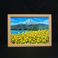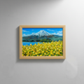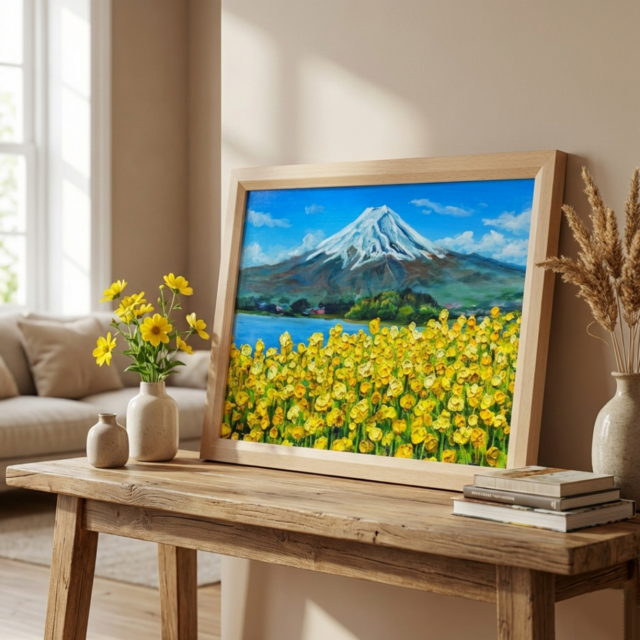 「春の息吹と、悠久の富士」は、春の柔らかな光と、菜の花の甘い香りが漂う感覚を見事に表現した特別な油絵です。画面いっぱいに広がる鮮烈な黄色は、冬の寒さを乗り越えて咲き誇る生命の力強さを感じさせ、見る者の心を打ちます。裏には悠然とした富士山が鎮座し、雪を戴いたその姿は神々しく、手前の可憐な花々を優しく見守っているようです。