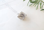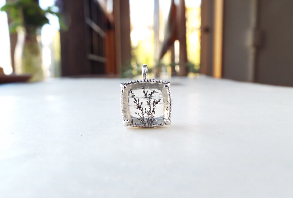 樹木のように見えるのが特徴の「デンドリティッククォーツ」を、「身に着ける植物標本」のイメージでネックレスにしました。