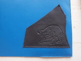 定番的にたくさん使わせていただいている『sacsac』さんのクッキー型をポケットに押して(経年変化の早い栃木レザー)、ぱきっとした青いクロムレザー(経年変化が少ない)に合わせてみました。