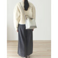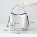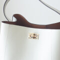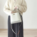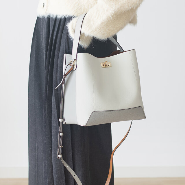 ・洗練された留め具とやわらかな配色が映える、上品なバケットバッグ