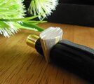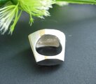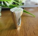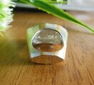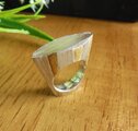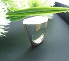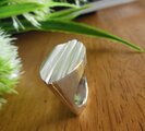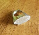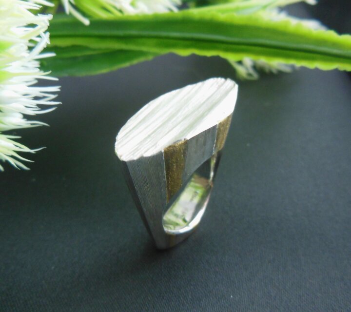シルバーに24Kゴールドをストライプ状に張り付けたリングです。トップは糸鋸の切断面の面白さをそのまま生かし、側面にはシルクラインと切り込みを入れ24Kゴールドをはめ込みました。ずっしりと重量感のあるリングです。