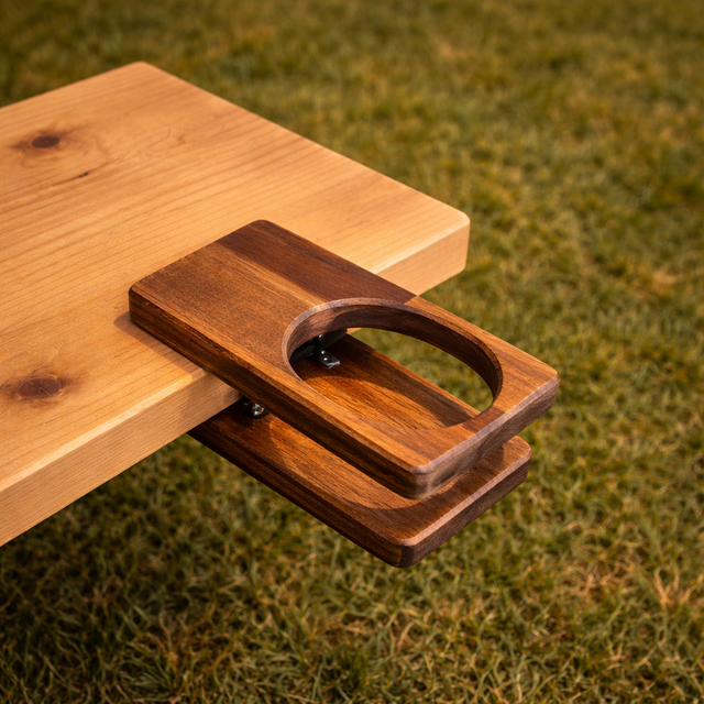 無垢材を使用した、クリップ式ドリンクホルダー。