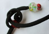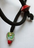 中綿を入れ、黒の正絹の着物で作ったループを付け、ループの先にトンボ玉と山サンゴ、途中にそろばんの玉を、長さ調整金具の代わりにを付けています。