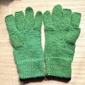 グリーンのOpal毛糸で3本指抜き5本指手袋を作成しました。ねこ&ねずみのアップリケ付きです。温かく、着脱の必要がないので、スマホ操作など、様々な場面で重宝します。