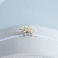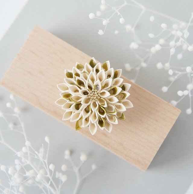 菊やダリアをイメージした高貴な佇まいに、アイボリーと金彩のコントラストを効かせ、大人の女性にふさわしい気品ある一品に仕上げました。