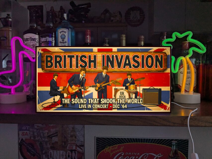 1960年代半ばにイギリスのロックやポップ・ミュージックをはじめとする英国文化がアメリカ合衆国を席巻した懐かしいデザインの電飾看板。
