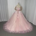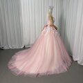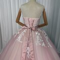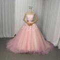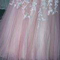カラードレス 薄桃色 ベアトップ キラキラ光る刺繍 リーフ刺繍 ミニトレーン 編み上げ フレアスカート 花嫁