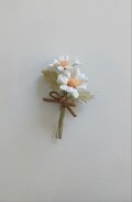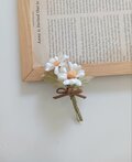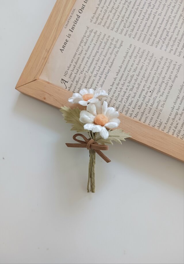 マーガレット2輪に葉を添え、リボンを結び、可愛いコサージュに仕上げました。
