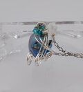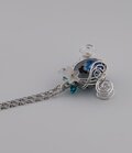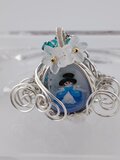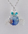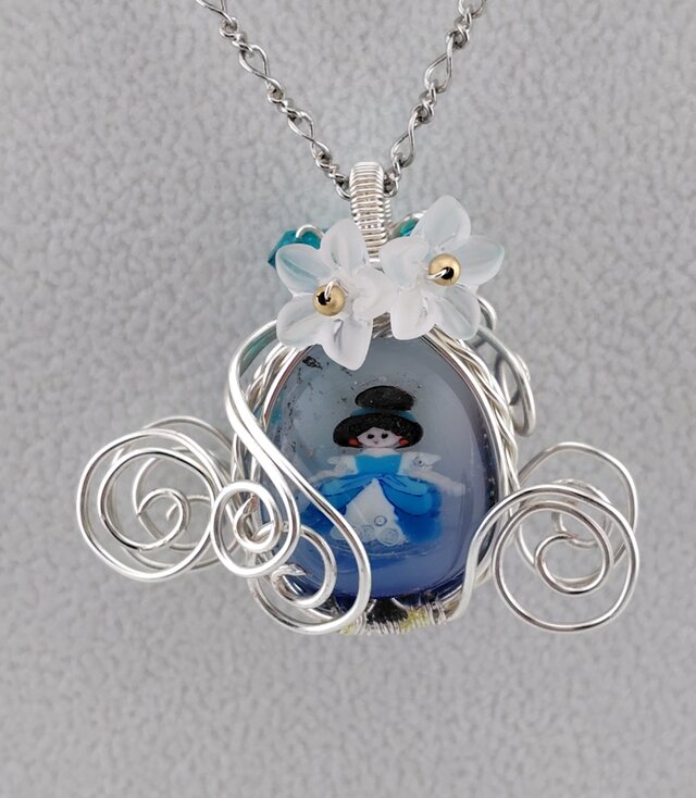 シンデレラ、馬車、城、靴のパーツを埋め込んだとんぼ玉をワイヤーで包み、アクセサリーに仕立てました。中のキラキラはプラチナ箔です。