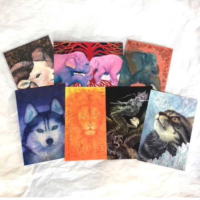シベリアンハスキー・ライオン・虹龍・ミラクルキャット・ヤギ・アジアゾウの親子・アジアゾウのポストカード、各1枚ずつの7枚セットです。