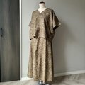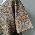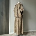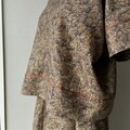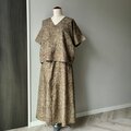 チュニックとスカートのセットアップです。チュニックは後ろ下がりのすっきりとしたVネック。お袖と裾の切り替え部分に、八掛に使用されていたブラウンのシルクでパイピング処理をしています。