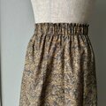 スカートは、長い台形に裁断した生地を6枚はぎました。ウエストベルトも無い続き見返しの作りで、ウエストと腰周りがすっきりと見えるデザインです。