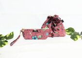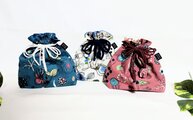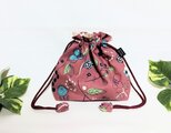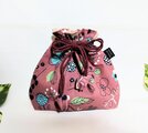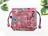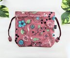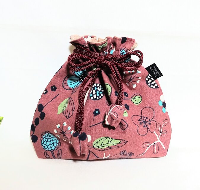 北欧風花柄、赤紫色(落ち着いたくすみ掛かった色合いです)にブルーの花柄、ナチュラルな綿リネン地の巾着袋です。