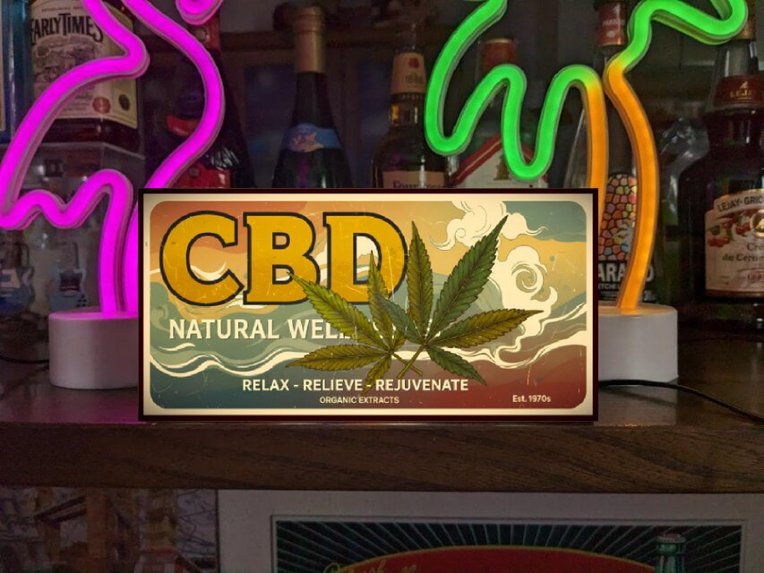 カラフルなCBDロゴと葉のデザインが特徴のコンパクトな照明。