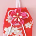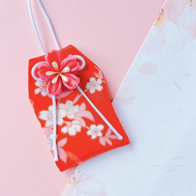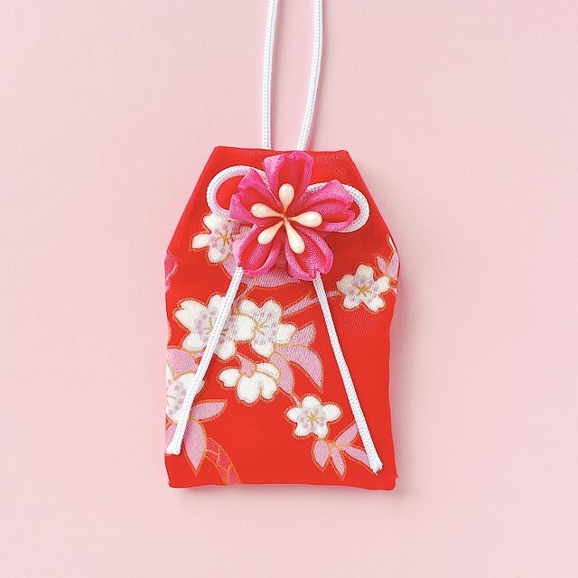 柔らかな着物生地を一針一針丁寧に仕立て、優しく微笑むような桜のつまみ細工を添えたお守り袋です。