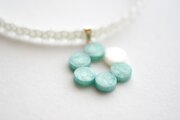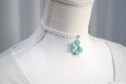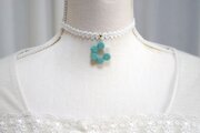 若芝のような優しく明るい緑のなか一色だけ違う差し色の白が清廉な印象のレジンを、サテンリボンにタティングレースで装飾を施したチョーカーに仕上げました。