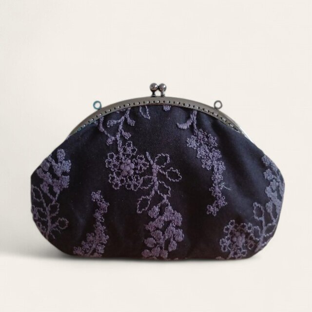 花柄刺繍 大きめがま口ポーチ 17cm口金 ブラック 661