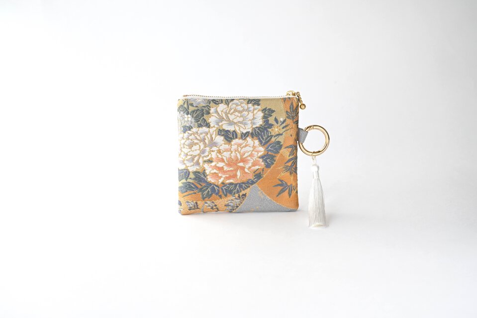 花丸文・華紋織出しのシルク帯で製作したバッグチャーム型スクエアポーチです。