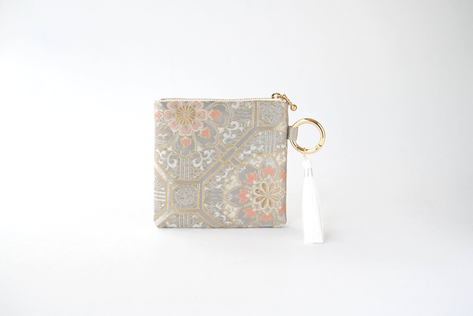 【西陣織・服部織物製 蜀江文に雲取り・花唐草模様 シルク帯リメイク バッグチャーム型スクエアポーチ】旅行 誕生日ギフトにも。