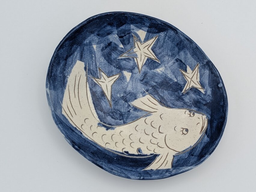 王冠をいただいた魚が、静かな夜を泳ぐ一点ものの器です。