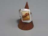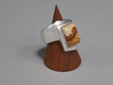 リングのサイズは13.5号、重さは13g、最大幅は23mm、手のひら側の幅は9mm、金属部分は純銀です。