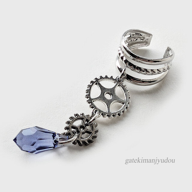 シルバーとガンメタ(メタリックな黒色)の色と形が違う歯車と雫型グラスビーズのイヤーカフです