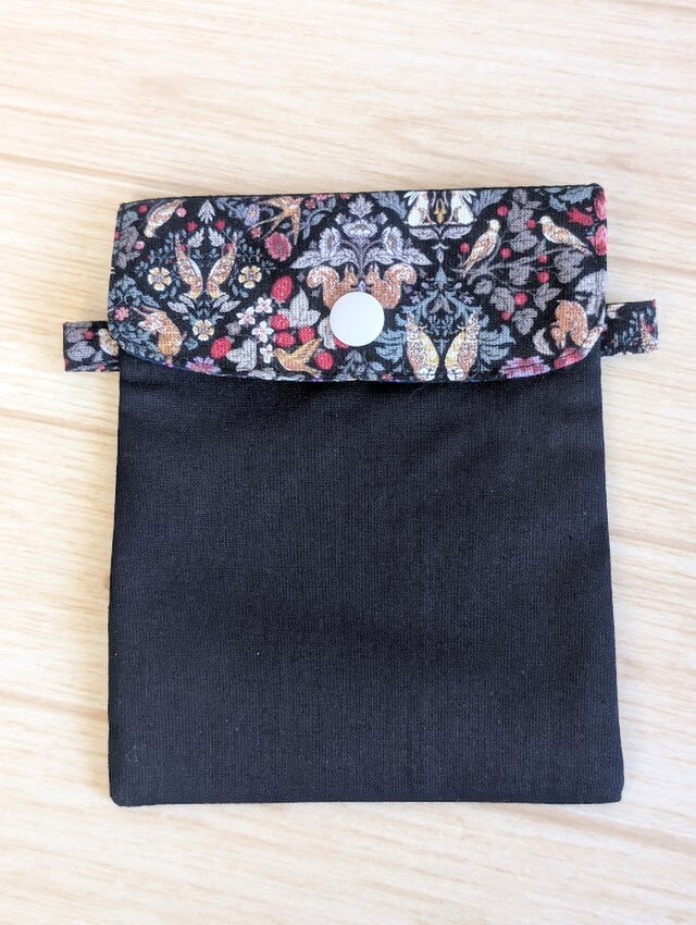プラスナップボタンなので少し硬いですが、中身がこぼれにくく、メモ帳やペン、ティッシュやハンカチ、カードや小物などをすっきり収納できます。